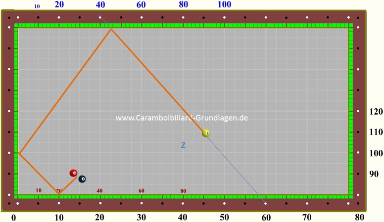 Da jeder Billardtisch ein Seitenverhältnis von 2:1 hat bietet es sich an die Skalierung auf der Zielbande zu verdoppeln.