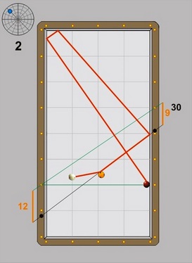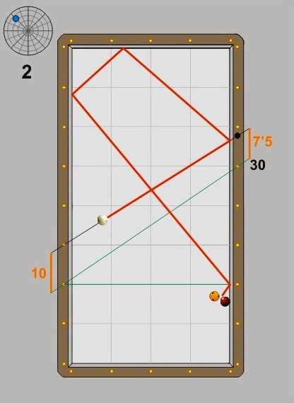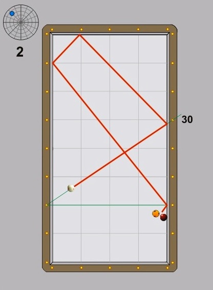 Bei einem direkten Stoß (Einballlösung) oder sehr flachem Winkel auf Ball 2 ist Stoßpunkt 2 aktiv! (1/2/3)