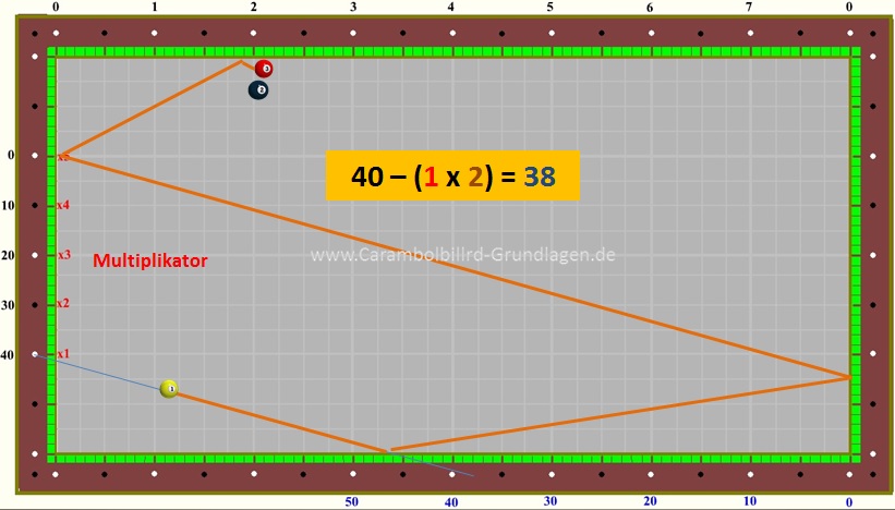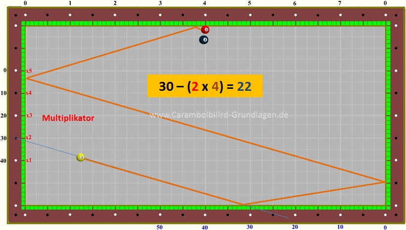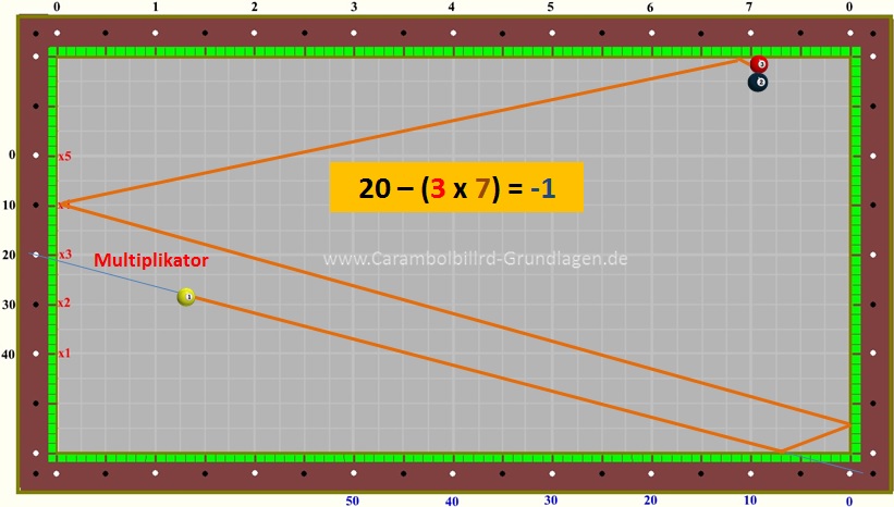 Der Ankunftspunkt an Bande 4 (DIA) wird mit dem Multiplikator des Startpunktes multipliziert und vom Startpunkt suptrahiert